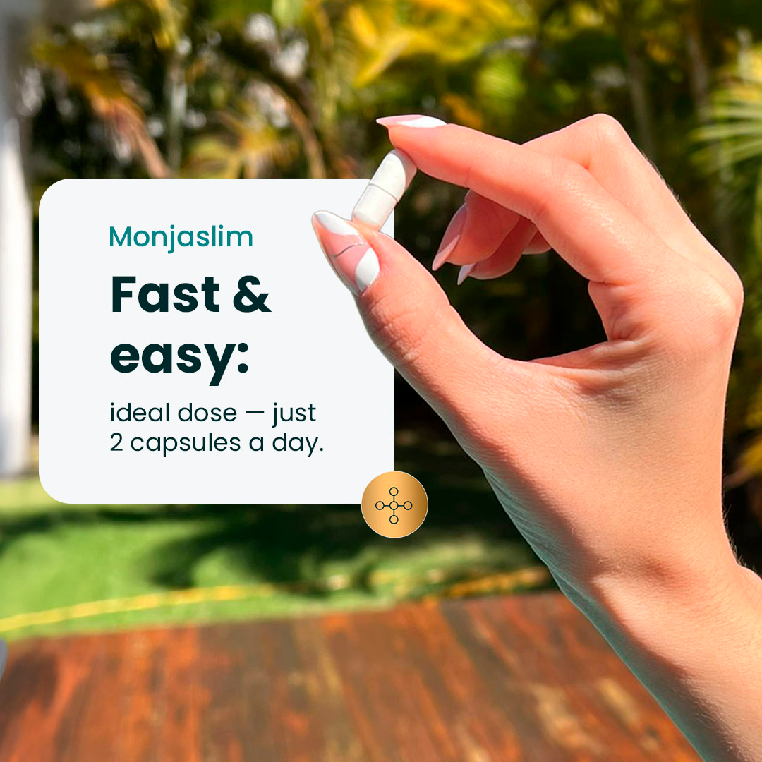 Adding MonjaSlim™ to your routine is simple: take 1 capsule before breakfast on an empty stomach and 1 capsule before lunch, always with a full glass of water.
